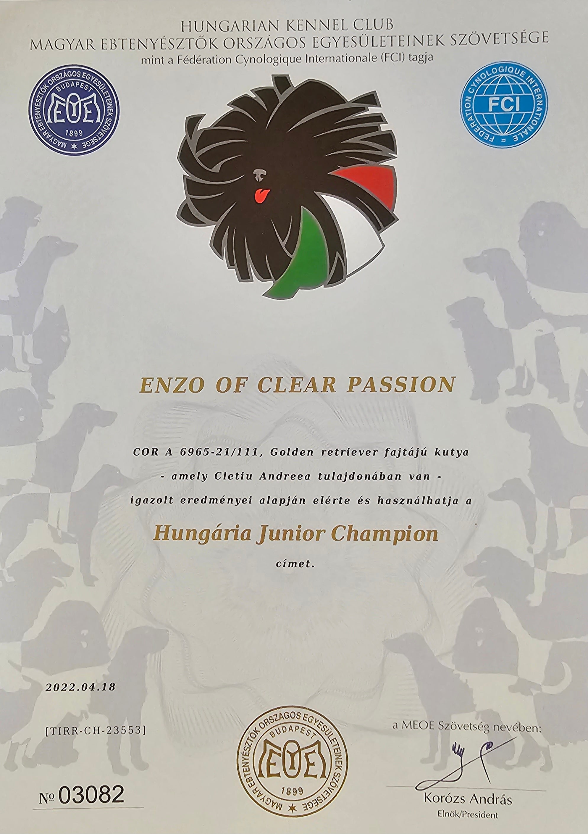 Enzo's portfolio includes completing the Junior Championship of Romania (3x CACJ), Junior Championship of Hungary (6 x HPJ) and Junior Championship of Serbia (3 x CACJ), by the time he was 13 months old. At 15 months of age he completed his Intermediate class - for the Romanian Championship, and he successfully finished his Romanian Championship at 15 months and 6 days by winning 4 x CAC, CACIB and BOS in the 4 shows in Bistrita, Romania.